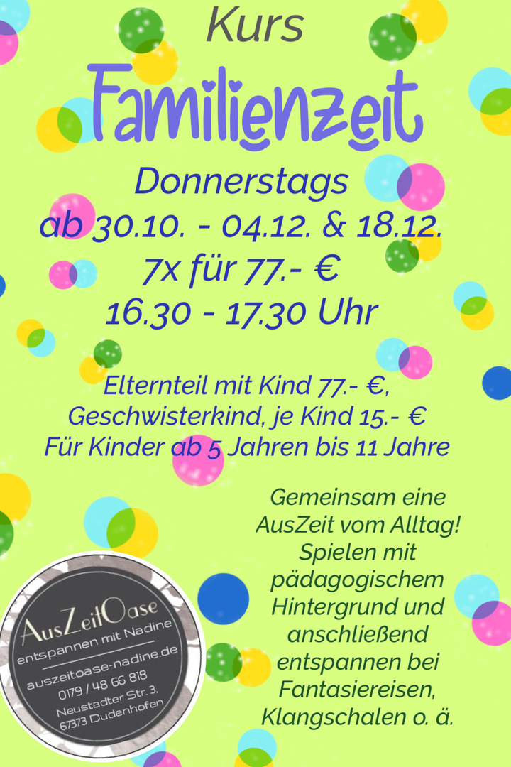 Kindheit heißt heute oft, Leben in einer Welt mit Terminen, Zeitdruck, Stress und Hektik, ähnlich dem Alltag der Eltern. Zur Ruhe kommen, einfach mal "runterkommen" ist oft schon eine Seltenheit. Der Kurs gibt genau dafür Raum und Zeit. Eine Stunde gemeinsam mit dem Kind verbringen (Mama oder Papa mit Kind), ohne Handy, Fernseher oder andere Einflüssen. Gemeinsam Spaß haben, zur Ruhe kommen, Kraft tanken und entspannen. Eine Auszeit nehmen, vom Alltag und vom Lärm des Tages.